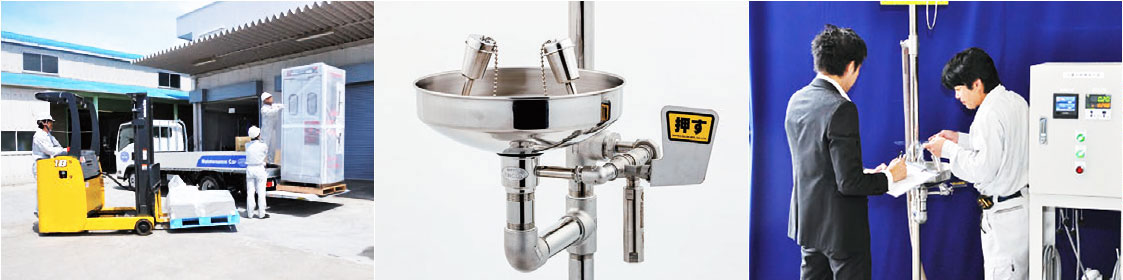 有害物質による事故に備えるために。 世界規格ANSI Z358.1対応の緊急⽤シャワー・洗眼装置を取り扱っております。